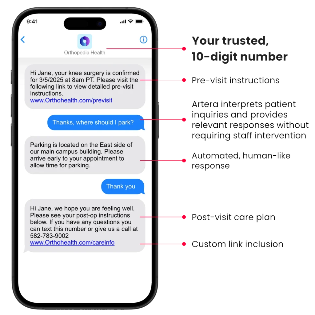 Example: Artera helps orthopedic clinics streamline this with automated post-visit care instructions and conversational messaging, creating a holistic patient experience that extends beyond the initial visit.