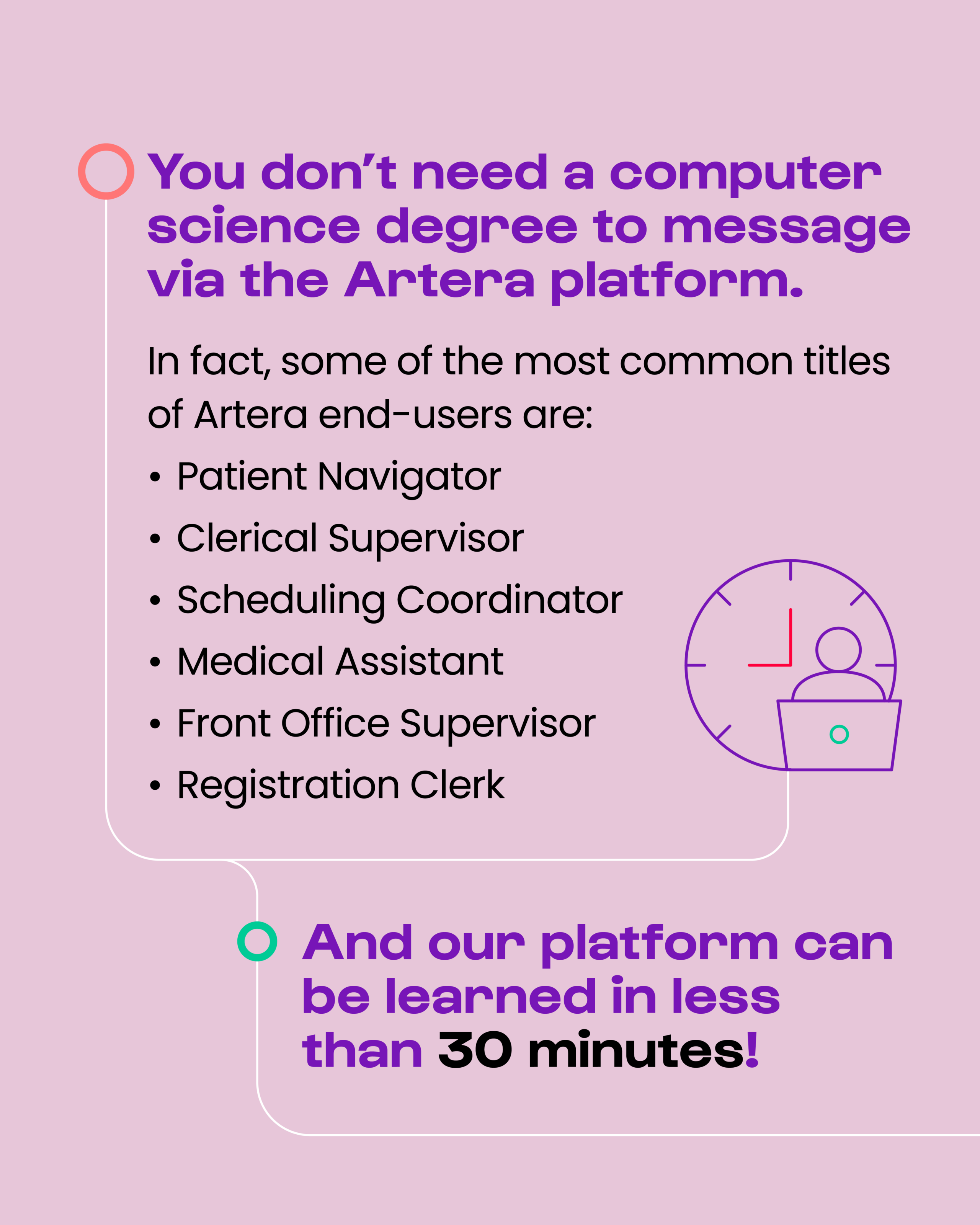 The belief that extensive technical training is needed to utilize conversational messaging is another barrier to its adoption. In fact, patient engagement platforms – such as Artera – are intuitive and require minimal training, if any. The Artera platform is so intuitive that it can be learned in as little as 30 minutes by staff.