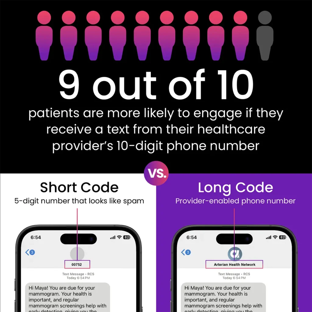 Patients are far more likely to trust and engage with messages from long-code phone numbers, as they perceive them as legitimate.