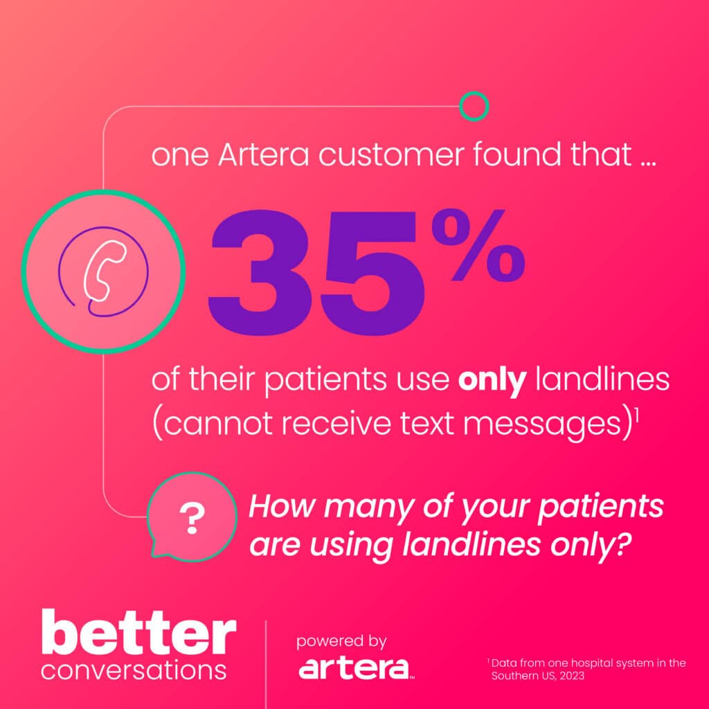 As a patient, you deserve options, especially in terms of how you communicate with your healthcare provider. Let’s just say you don’t have a cellphone, or maybe you’re just not that into texting and prefer calling or emailing instead. While this may seem shocking to some in today’s world, nearly 1 out of 5 patients use landlines only (i.e. cannot receive text messages.)2 This number may very well be more than that, too – in fact, one Artera customer in the Southern U.S. found that 35% of their patients were using landlines only.