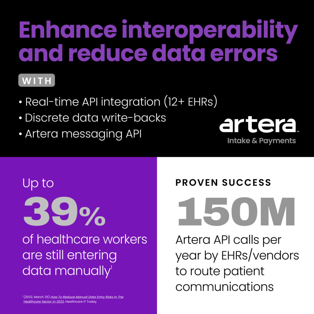 In addition to these key benefits, modern intake and payment solutions like Artera’s integrates smoothly with electronic health records (EHRs), ensuring that patient information is readily available and consistent across all healthcare touchpoints. This integration supports better clinical decision-making and enhances care continuity.